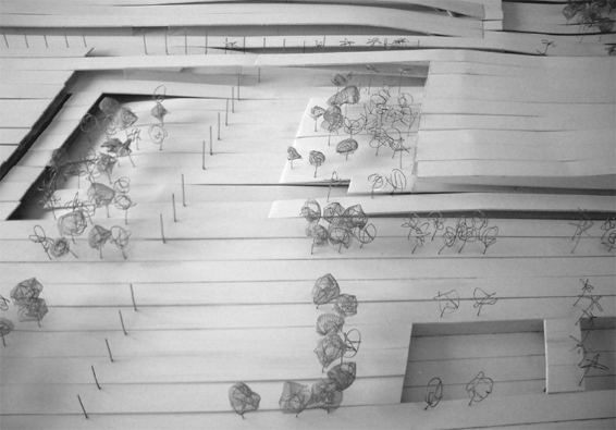 · Conceptual approach and study of alternatives The Project supposes an evolution from the vision of the traditional commercial center buildings adding to the commerce a mix of uses in order to create a vital, vibrant an diverse urban environment. The main idea is to provide the area with a big commercial facility in the diving line between Barcelona and Hospitalet del Llobregat including residential and leisure uses and especially understanding and designing the building as a territorial park. The project and the program is organized around the idea of parallel activity bands or stripes. By its continuity the different spaces are conformed. Taking the principles of the regulated geometry, the curving is worked out for the different sections.