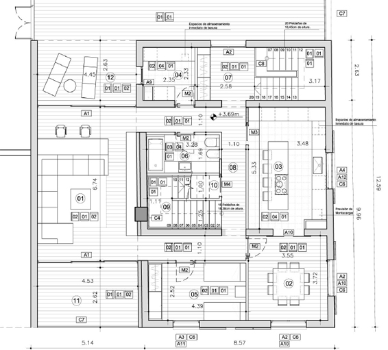 House to be developed in three floors (G+2) according to the existing volume with some new additions on the ground floor and first level. It includes four bedrooms, 2 full baths, dining and living room space, kitchen, laundry room, and three parking spaces. All these spaces are organized according the need for natural lighting and the privacy level required for each of them. Access is done on the ground floor, from garage area by car or through an independent hall area located on the northeaster façade. This level contains the parking areas and all service rooms and storage.